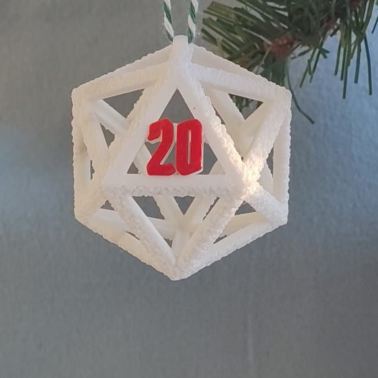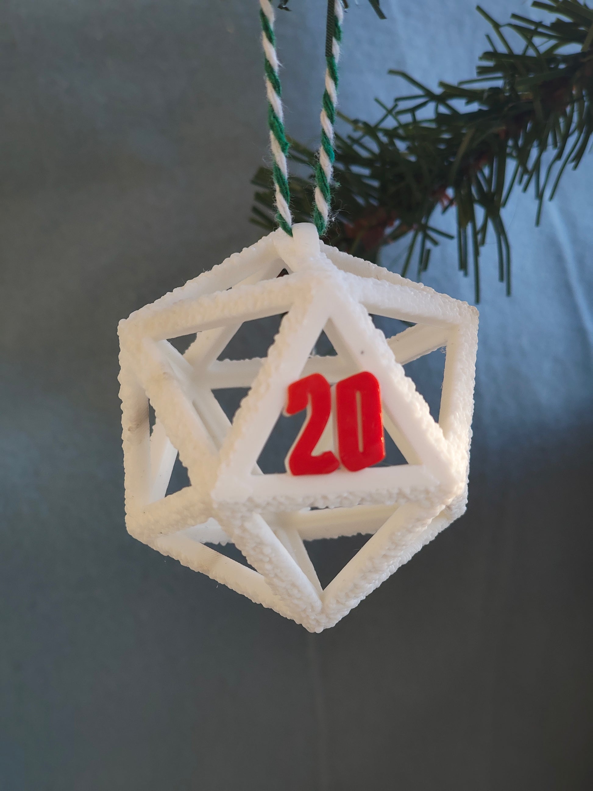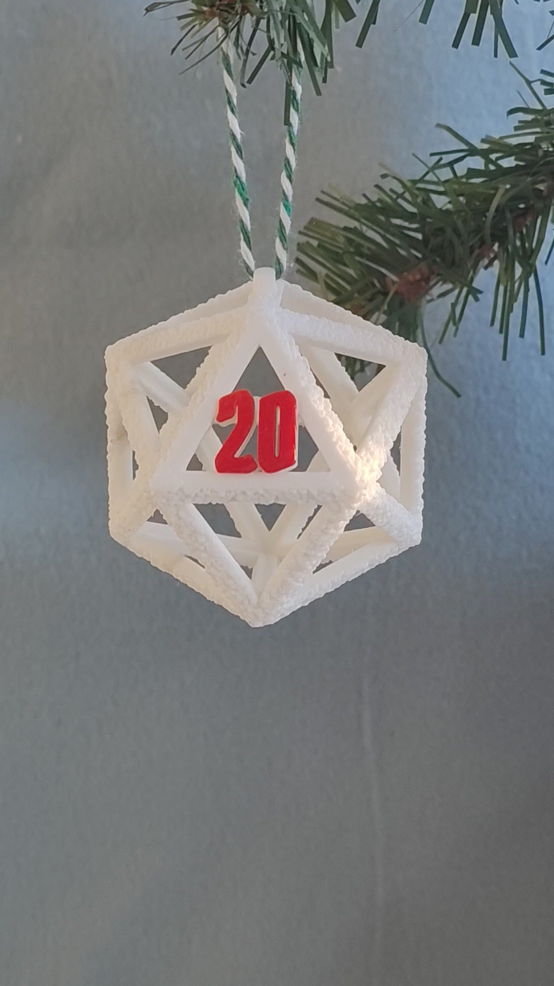 Each decoration is 3d printed using FDM 3d printers, the 20 sided dice frame is printed in a textured white making it look snowy, and the 20 is printed in a bright red to stand out.