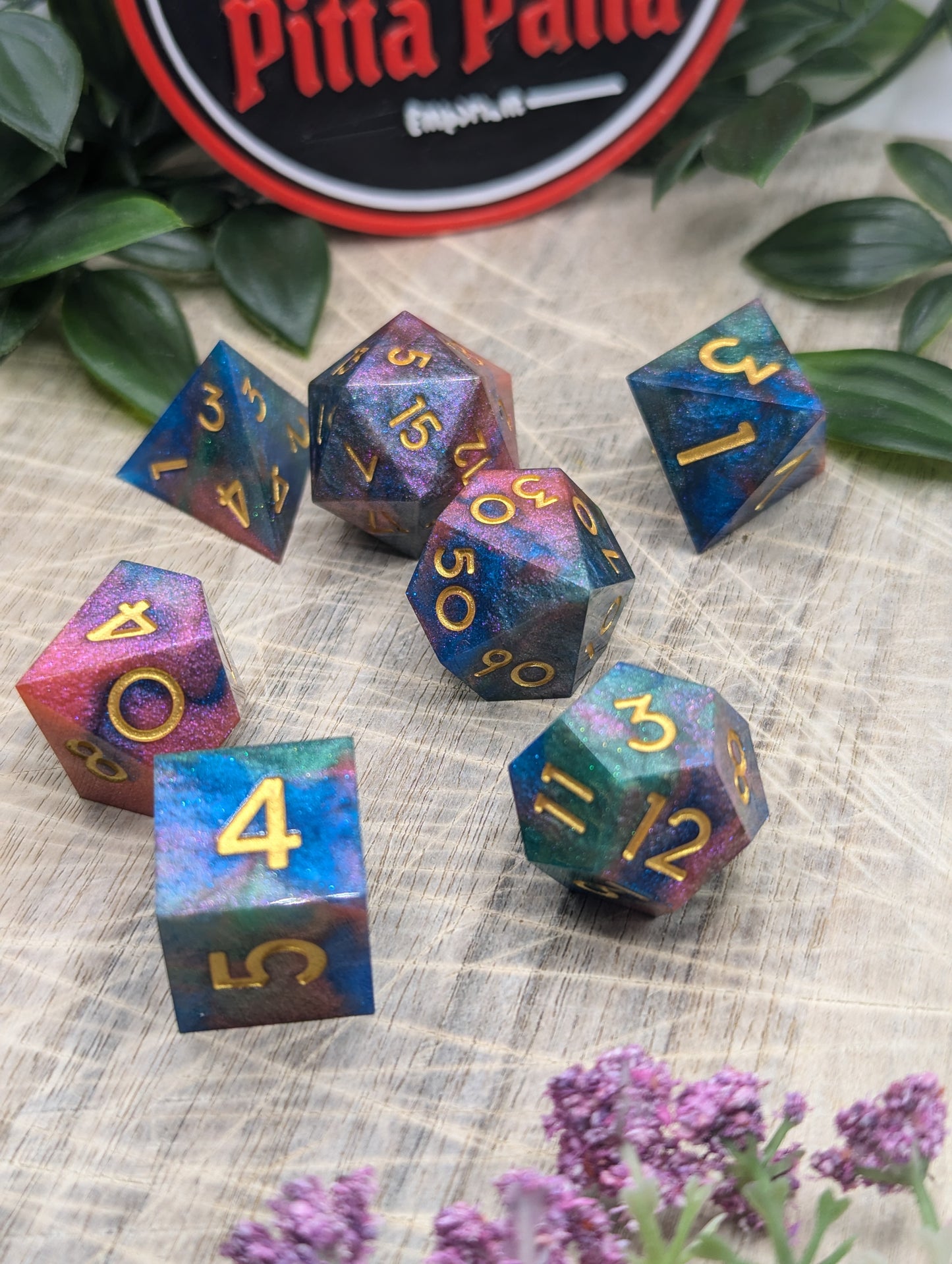 A set of 7 sharp-edge polyhedral resin dice for use with Dungeons and Dragons and other TTRPG's.